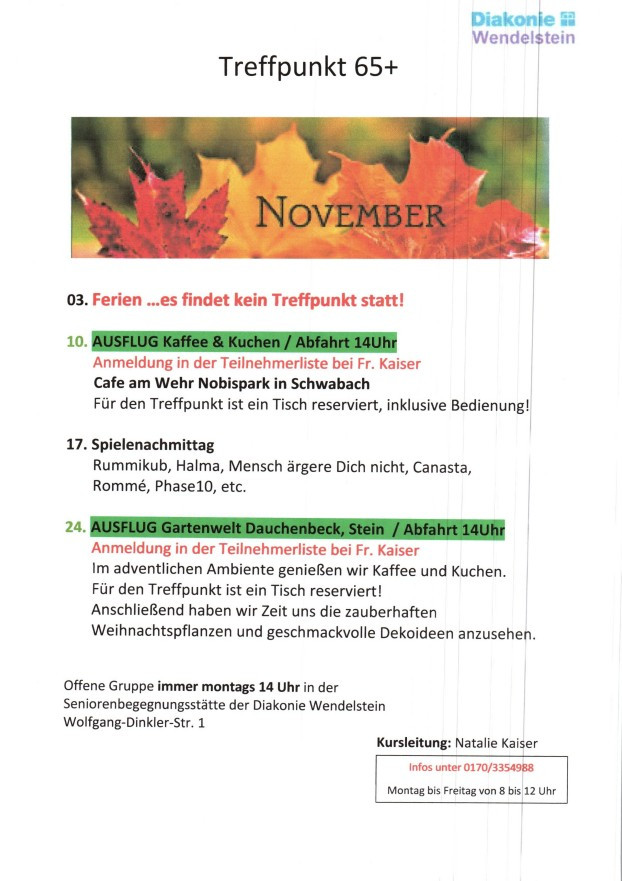 Ein Angebot für Frauen und Männer ab 65. Dieses Angebot findet im  Haus der Diakonie unter der Leitung von Frau Natalie Kaiser statt und wendet sich an jüngere, selbständige Senioren. Dafür gibt es ein gesondertes Programm. Gespräche, Bewegung, Gedächtnistraining, Theologie, Literatur, Ausstellungen, Museen, Kirchen, Filme, Ausflüge... werden für ein buntes Programm sorgen. Möchten Sie mehr darüber wissen rufen Sie uns an. Sie erhalten dann ein Programm und erfahren mehr über diesen Kreis.